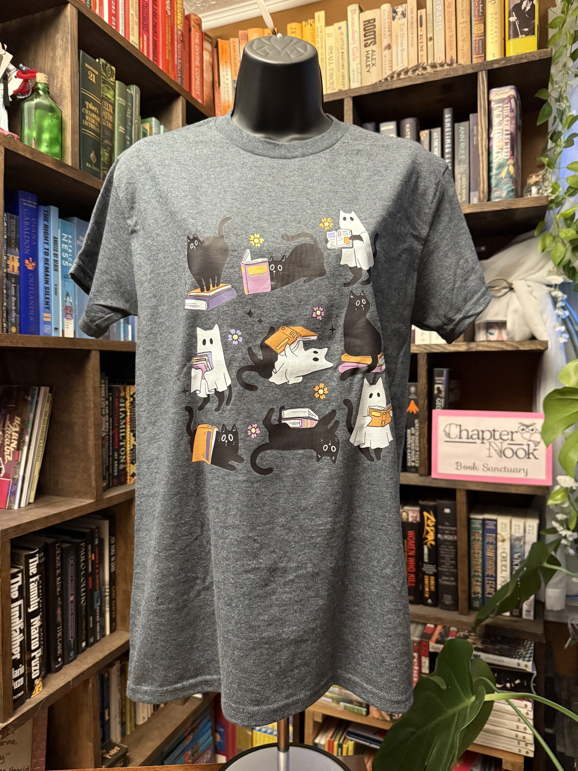This adorably spooky, heather-grey tee is the ultimate Halloween treat for book lovers and cat fans. Featuring playful kitties reading, lounging, and dressing up as friendly little ghosts, it’s a purr-fect mix of spooky and sweet. Whether you’re trick-or-treating, browsing your local bookstore, or curling up with a good ghost story, this comfy tee will keep your October cozy and magical.